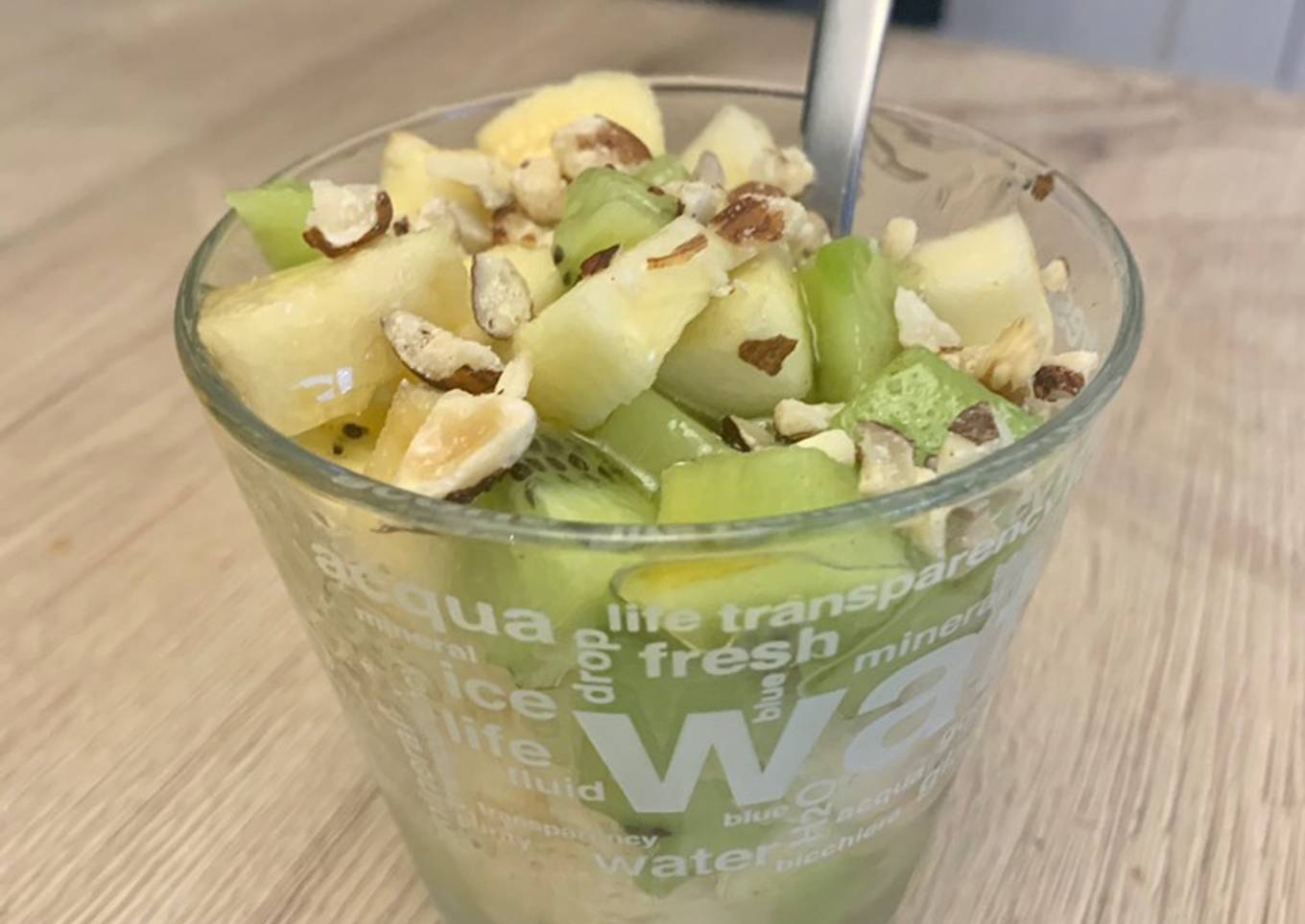 - Mélanger dans un joli verre ou ramequin les fruits, le miel et les noix concassées. C’est prêt !