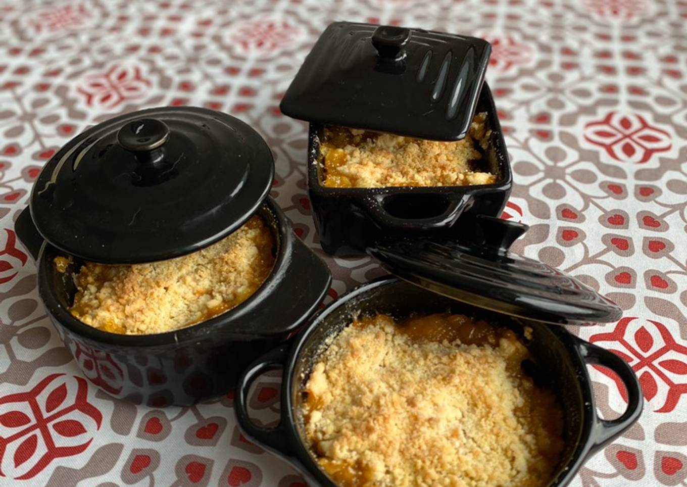 - Mettre les pommes au fond d’un plat ou petits ramequins, et mettre au dessus la pâte à crumble.