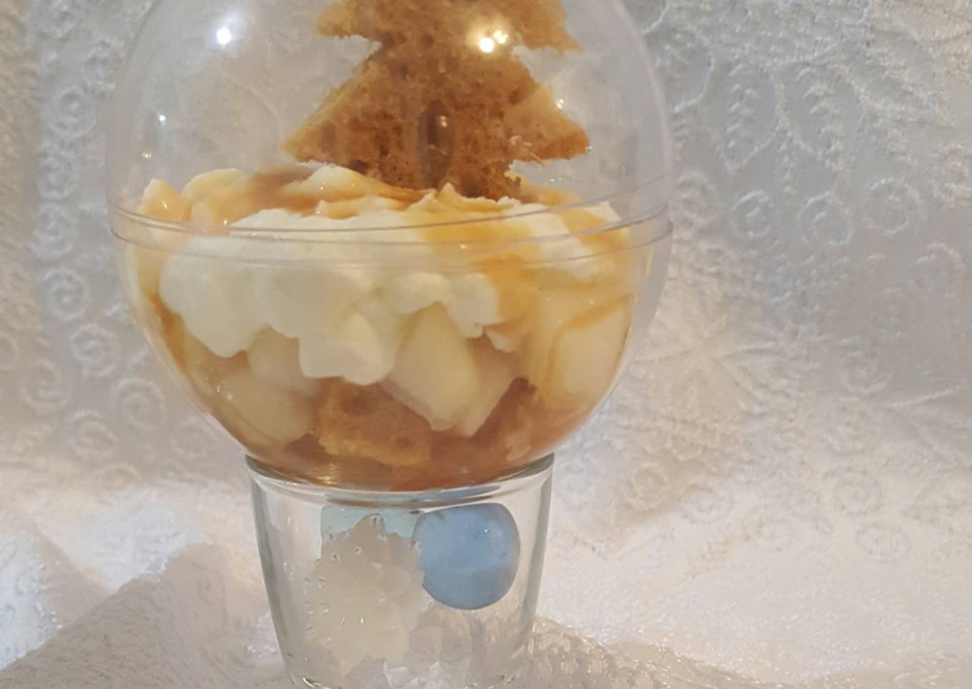 - Dans des boules de décoration de noel ou à défaut des verrines, une couche de pain d'épices puis une couche de poires suivi d'une couche de crème chantilly et une couche de caramel, refaire les étapes selon la grandeur de votre boule ou verrines