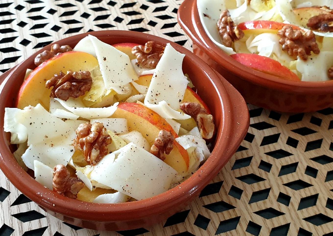 Ajoutez ensuite un quart de pommes par personne, coupé en tranches et disposez les joliment entre les feuilles d'endives. - Ajoutez des copeaux de fromage de brebis (aidez vous d'un économe pour faire ça 😉) et ensuite les cerneaux de noix.