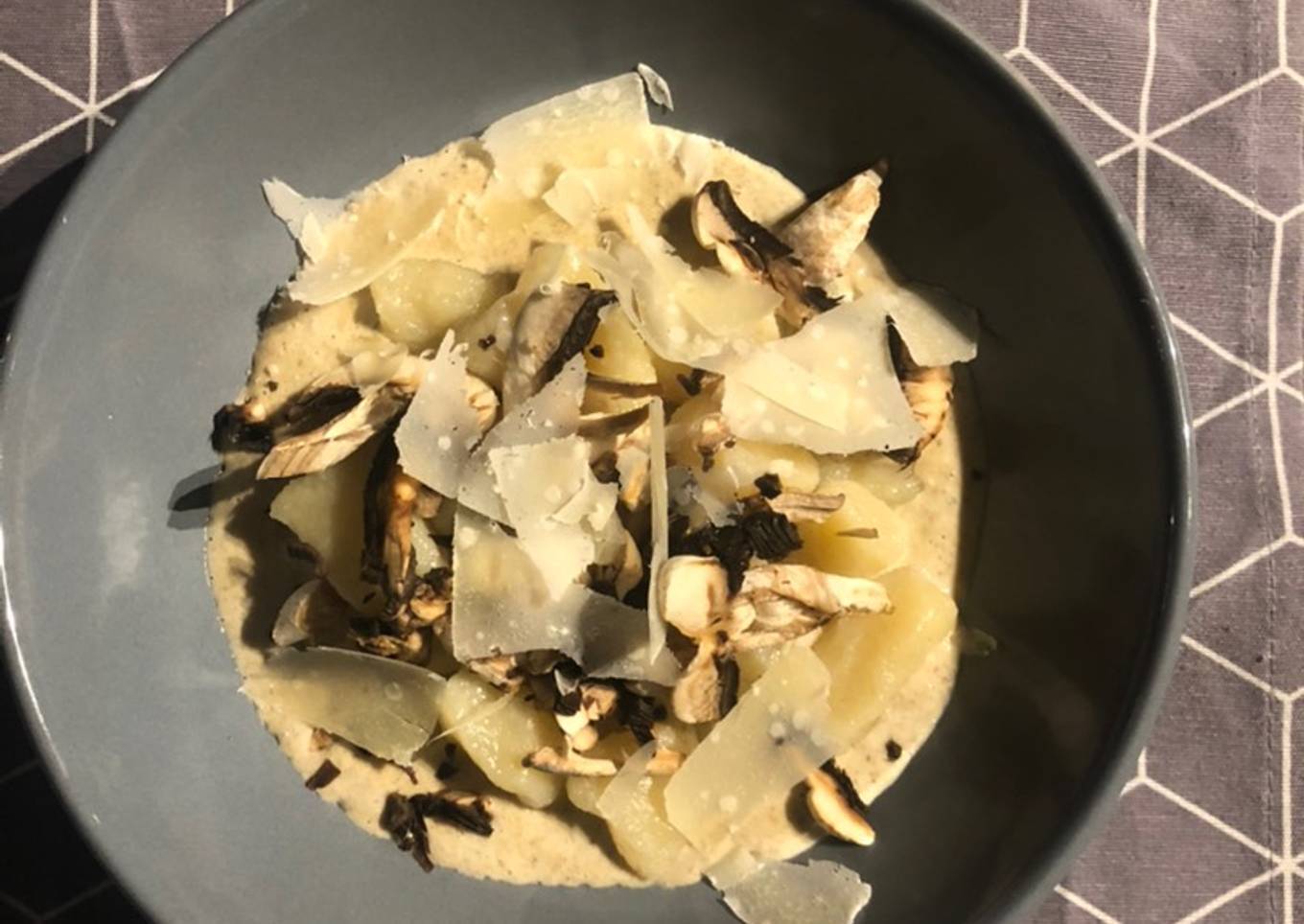 - Place au dressage : verser la crème de champignons dans le fond de l’assiette, les gnocchis, les champignons émincés et des copeaux de parmesan.